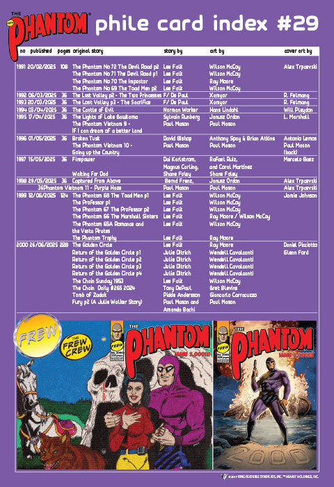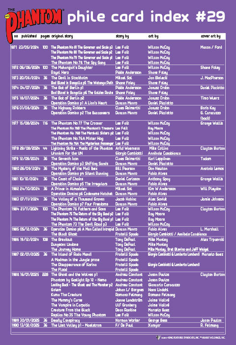 Complete your philecard binder with this index page. The index contains additional information about the comic on each philecard.