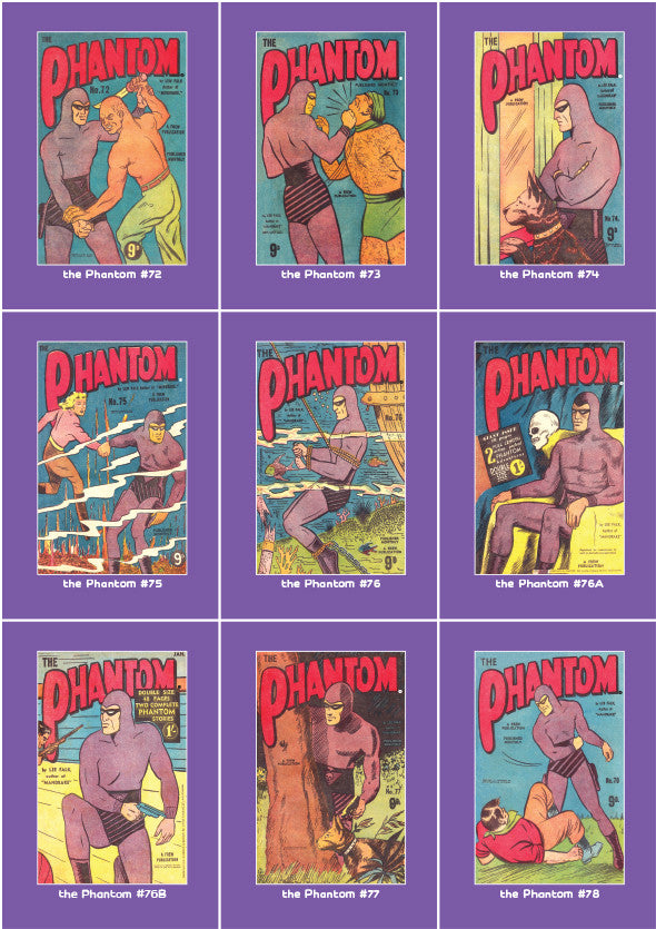 Frew are introducing the Phantom Philecard. Each Philecard is a trading card sized (63 x 89 mm), showing the cover on one side and all of the publication information for that issue on the reverse side. This information consists of the publishing date, the name of the story, the name of the original story, the cover artist, number of pages and cover price. (Please note that Frew’s records are incomplete and some of this information may be generalised). Frew has gathered the information from historians Barry Stubbersfield and David Budds, distributor Gordon and Gotch, and their own archives. They come in packs of 9 and they will start from issue #1. So the first pack will comprise issues 1-9, 2nd pack 10-18, etc, etc. Each new pack will be issued with each new issue.
