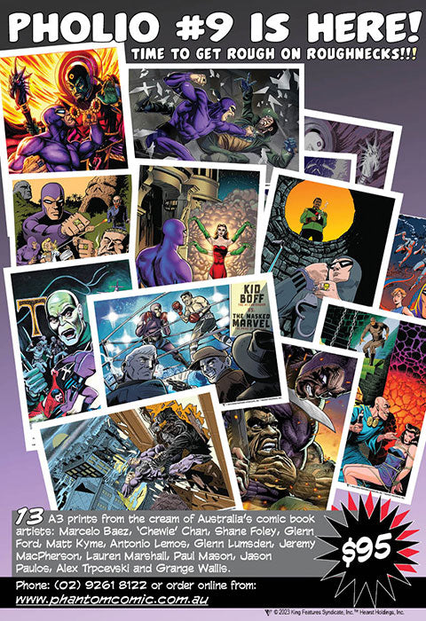 Featuring the 13 full-size, uncropped art of the Phantom with a calvalcade of villians! Being as as we might expect, "rough on roughnecks. "